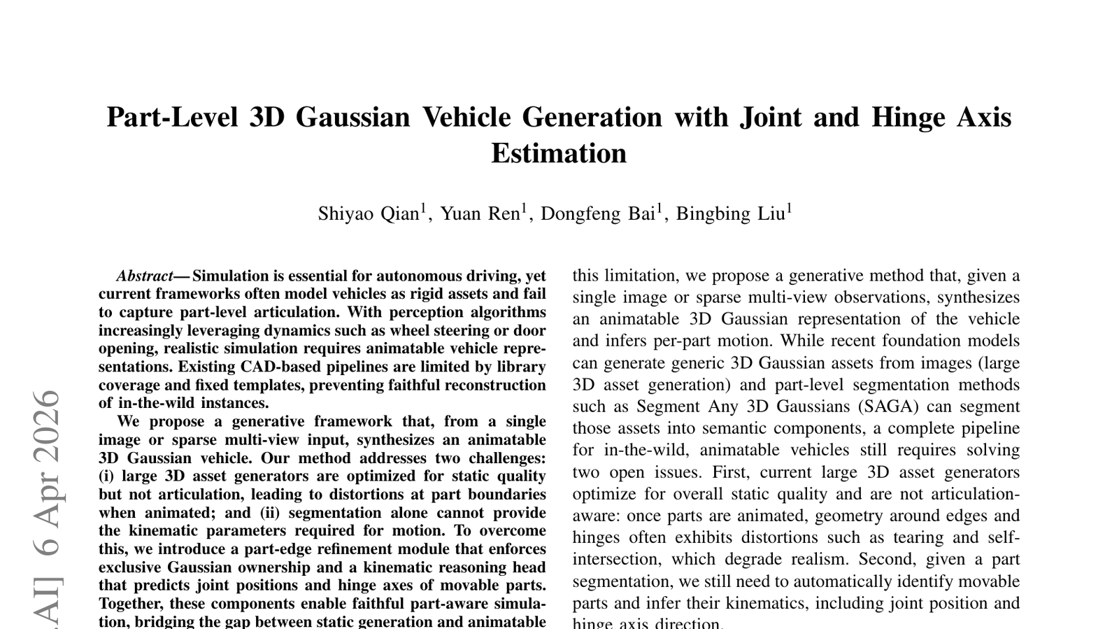 이 논문은 자율주행 시뮬레이션에서 차량을 주로 강체 자산으로 모델링하여 부분별 관절 움직임을 포착하지 못하는 기존 프레임워크의 한계를 지적합니다. 저자들은 이 문제를 해결하기 위해 부분별(part-level) 3D 가우시안 차량 생성과 관절 및 힌지 축 추정(Joint and Hinge Axis Estimation) 기술을 제안합니다. 이 기술은 차량의 문, 후드, 바퀴 등 각 부품의 유연한 움직임을 사실적으로 시뮬레이션할 수 있게 하여, 자율주행 시스템이 더욱 복잡하고 현실적인 시나리오에 대비할 수 있도록 돕습니다. 예를 들어, 사고 상황에서 차량 부품의 변형이나 개별 부품의 움직임을 정확하게 예측하는 것은 자율주행 AI의 안전성과 신뢰성을 높이는 데 필수적입니다. 이 연구는 자율주행 시뮬레이션의 정확도를 비약적으로 향상시켜, AI 기반 자율주행 기술의 개발 및 검증 과정에 중요한 기여를 할 것입니다. 현실과 더욱 유사한 시뮬레이션 환경은 자율주행 시스템이 예상치 못한 상황에 효과적으로 대응하는 능력을 기르는 데 결정적인 역할을 하며, 궁극적으로 더 안전한 자율주행 차량을 만드는 데 필수적인 단계입니다. 이는 시뮬레이션 기술이 AI 개발에 얼마나 중요한지를 보여주는 좋은 예시입니다.