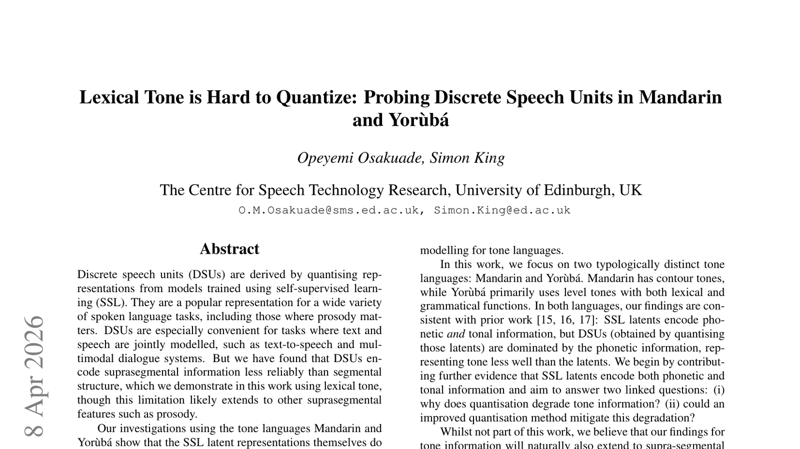 이 연구는 '어조(Lexical Tone)는 양자화하기 어렵다'는 전제 아래—만다린어(Mandarin)와 요루바어(Yor\`ub\'a)와 같은 어조 언어(tonal languages)에서 이산 음성 단위(Discrete Speech Units, DSUs)의 특성을 탐색합니다. DSUs는 자기 지도 학습(Self-Supervised Learning, SSL)을 통해 훈련된 모델의 표현을 양자화하여 파생되는 개념으로—음성 처리 분야에서 인기를 얻고 있습니다. 그러나 어조 언어에서는 소리의 높낮이 변화가 단어의 의미를 결정하기 때문에—이를 이산적인 단위로 정확하게 표현하는 것이 매우 도전적입니다. 이 논문은 어조 언어의 음성 처리 모델을 개발하는 데 있어 DSUs의 한계와 가능성을 심층적으로 분석합니다. 이는 AI 음성 모델이 다양한 언어적 특성을 더욱 정교하게 이해하고 처리할 수 있도록 돕는 데 중요한 기초 연구가 될 것입니다. 특히 다국어 AI 모델의 성능을 향상시키는 데 기여할 잠재력이 큽니다.