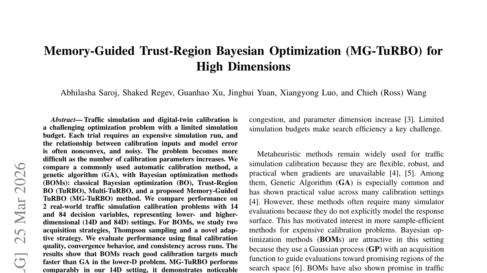 교통 시뮬레이션 및 디지털 트윈 보정은 제한된 시뮬레이션 예산으로 인해 어려운 최적화 문제입니다. 각 시도에 많은 비용이 드는 고차원 환경에서 효율적인 최적화는 매우 중요합니다. 이 논문은 고차원 문제에 효과적인 메모리 기반 신뢰 영역 베이지안 최적화(MG-TuRBO)를 제안합니다. MG-TuRBO는 과거의 최적화 이력을 활용하여 현재의 탐색 공간을 효율적으로 제한하고, 더 나은 솔루션을 빠르게 찾아낼 수 있도록 돕습니다. 이는 시뮬레이션 예산이 엄격하거나 평가 비용이 높은 실제 환경 문제(예: 신소재 개발, 복잡한 시스템 설계 최적화)에서 AI 기반의 의사결정 효율성을 극대화하는 데 기여할 수 있습니다. 이는 AI를 통한 과학적 발견과 엔지니어링 설계의 속도를 가속화할 것입니다.