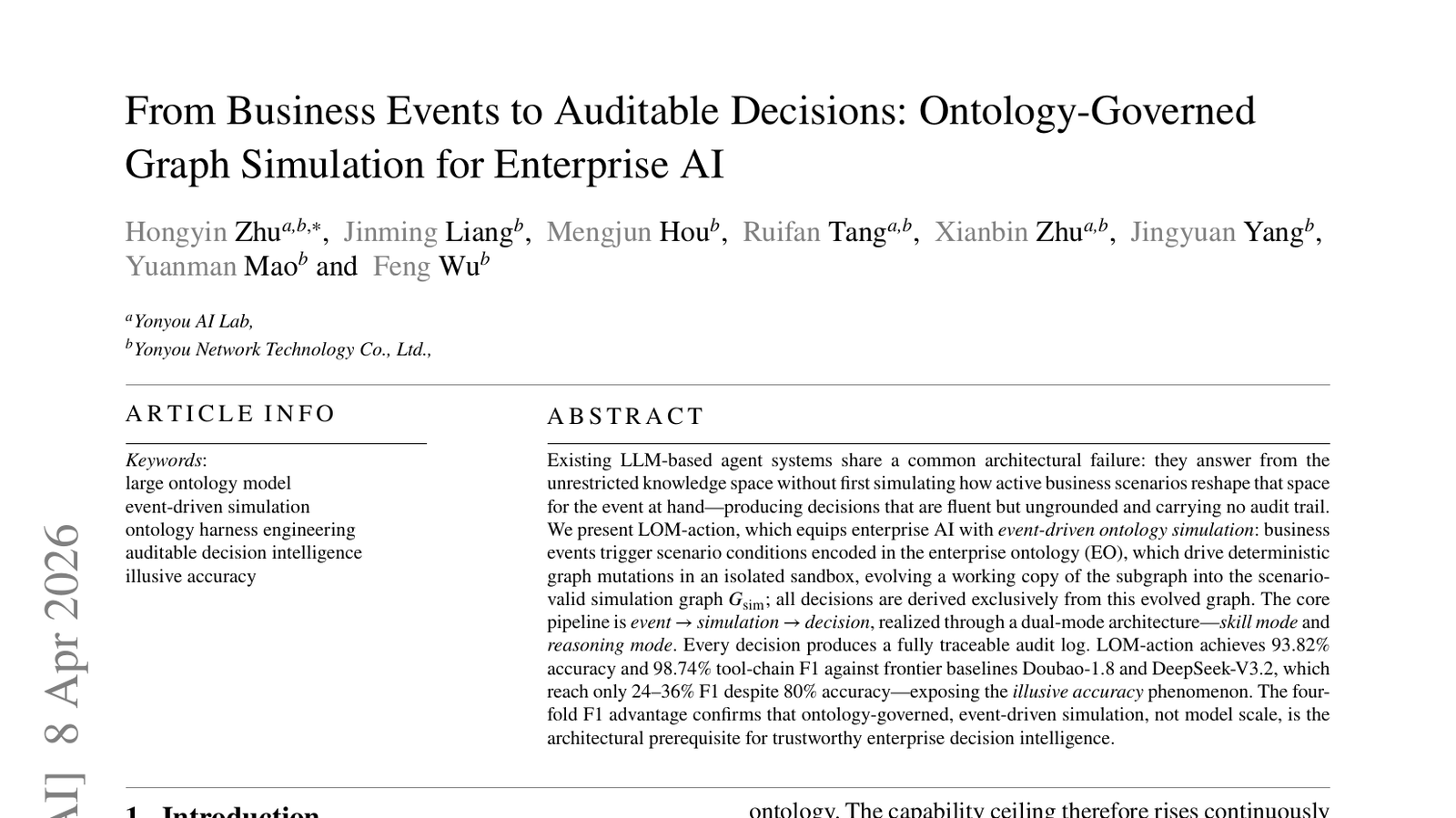 기존 LLM 기반 에이전트 시스템은 제한 없는 지식 공간에서 답변을 생성하는 공통적인 아키텍처적 결함을 공유합니다. 이 논문은 기업 AI를 위한 온톨로지 기반 그래프 시뮬레이션을 제안하여, 비즈니스 이벤트로부터 감사 가능한(auditable) 의사결정을 도출하는 새로운 접근 방식을 제시합니다. 이는 LLM이 단순히 정보를 생성하는 것을 넘어, 특정 비즈니스 도메인의 온톨로지(지식 체계)와 그래프 시뮬레이션을 통해 복잡한 비즈니스 규칙과 제약 조건을 준수하는 의사결정을 내릴 수 있도록 돕습니다. 이를 통해 AI가 내린 결정의 투명성과 설명 가능성을 높이고, 기업 환경에서 AI 시스템의 신뢰성과 책임감을 확보하는 데 중요한 역할을 합니다. 금융, 법률, 규제 준수 등 높은 투명성과 감사 가능성이 요구되는 분야에 특히 유용합니다. AI의 '블랙박스' 문제를 해결하려는 중요한 시도입니다.