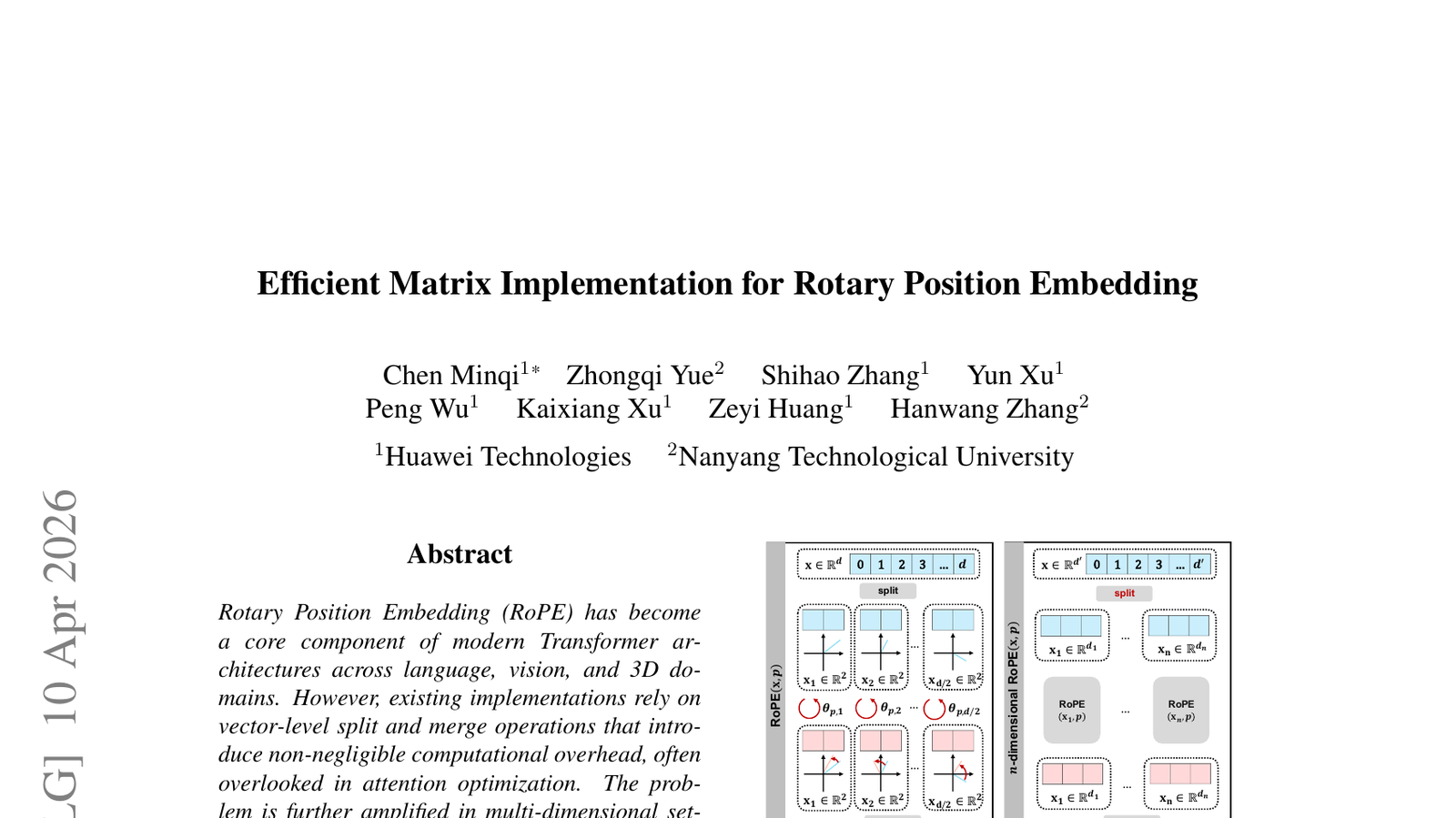 이 논문은 로터리 위치 임베딩(RoPE)의 효율적인 행렬 구현 방안을 제시합니다— RoPE는 언어, 비전, 3D 도메인 등 현대 트랜스포머 아키텍처의 핵심 구성 요소로 자리 잡았습니다— 그러나 기존 구현 방식은 계산 효율성 측면에서 개선의 여지가 있었습니다— 본 연구는 RoPE의 행렬 연산을 최적화하여 모델의 훈련 및 추론 속도를 크게 향상시킬 수 있는 방법을 제안합니다— 이는 특히 대규모 언어 모델(LLM)과 같은 거대한 트랜스포머 모델의 연산 비용을 절감하고, 더 긴 시퀀스를 효율적으로 처리하는 데 기여할 것입니다— 즉, 적은 리소스로도 더 크고 복잡한 AI 모델을 개발하고 배포할 수 있게 되는 기반 기술입니다— 이 기술적 진보는 AI 모델의 확장성과 접근성을 높이는 데 중요한 역할을 하며, 다양한 AI 애플리케이션의 성능 향상으로 이어질 수 있습니다.