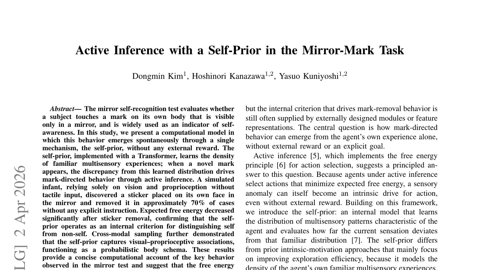 이 논문은 거울 자기 인식 테스트(mirror self-recognition test)를 AI 시스템에 적용하여 '자기 선행 지식(self-prior)'을 가진 능동 추론(Active Inference)을 탐구합니다— 거울 자기 인식 테스트는 주체가 거울에만 보이는 자신의 몸에 있는 표식을 만지는지를 평가하는 것으로, 지능과 자의식의 척도로 널리 사용됩니다— 본 연구는 AI가 자신에 대한 정보를 추론 과정에 통합할 때 어떤 방식으로 행동하는지를 분석하며, AI의 인지 능력과 자율성 발전에 대한 새로운 통찰을 제공합니다— AI가 환경뿐만 아니라 자기 자신의 상태와 능력에 대한 모델을 형성하고 이를 바탕으로 행동을 계획할 수 있다면, 더욱 정교하고 인간과 유사한 지능을 구현할 수 있을 것입니다— 이 연구는 AI가 단순한 도구를 넘어, 환경과 자신을 인식하고 상호작용하는 방식으로 발전할 가능성을 시사하며, AI의 의식이나 자율성에 대한 철학적 논의에도 중요한 함의를 던집니다.