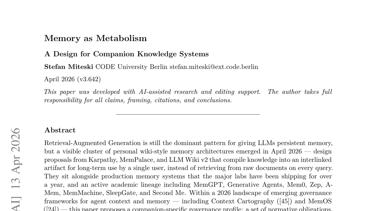 LLM에 지속적인 기억을 부여하는 데 Retrieval-Augmented Generation(RAG)이 여전히 지배적인 패턴이지만, 개인 위키 스타일 메모리 아키텍처의 눈에 띄는 클러스터가 '대사로서의 기억(Memory as Metabolism)'이라는 새로운 개념을 제안하고 있습니다— 이 논문은 인간의 신체가 에너지를 대사하듯, AI의 기억 시스템도 정보를 '대사'하여 지식을 관리해야 한다고 주장합니다. 이는 단순한 정보 검색을 넘어, AI가 기억을 능동적으로 처리하고 조직화하며, 시간이 지남에 따라 재구성하는 방식으로 발전해야 한다는 의미입니다— 이러한 동반자 지식 시스템은 AI가 사용자와 더 깊은 수준의 상호작용을 하고, 개인화된 경험을 제공하며, 장기적인 관계를 구축하는 데 필수적입니다. AI를 단순한 도구가 아닌 '지식 동반자'로 만들려는 시도인 셈입니다— 결국, 이 연구는 AI의 기억 시스템을 인간의 인지 과정에 더 가깝게 설계하여, 더욱 직관적이고 유용한 AI를 만드는 데 중요한 기여를 할 것입니다.