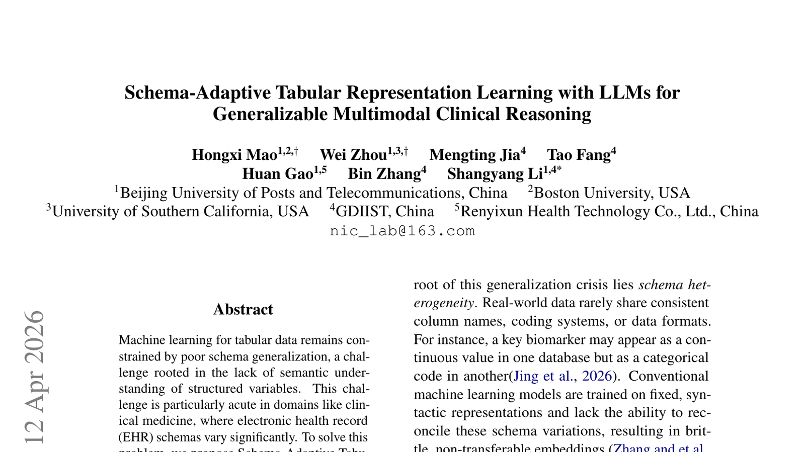 스키마 적응형 테이블형 표현 학습— LLM을 이용한 일반화 가능한 멀티모달 임상 추론