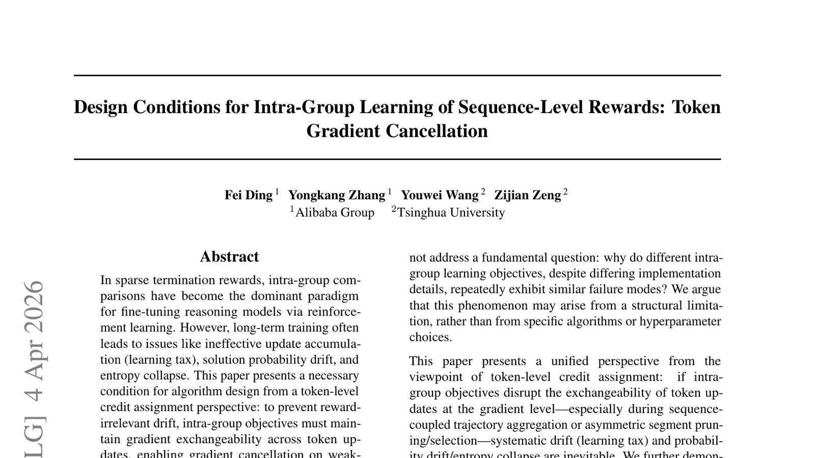 희소한 종료 보상(sparse termination rewards) 환경에서 강화 학습을 통해 추론 모델을 미세 조정할 때, '그룹 내 비교(intra-group comparisons)'가 지배적인 패러다임이 되었습니다. 이 논문은 시퀀스 레벨 보상 학습에서 이러한 그룹 내 학습의 효율성과 안정성을 높이기 위한 설계 조건을 탐구합니다. 특히, '토큰 그라디언트 상쇄(Token Gradient Cancellation)'라는 현상을 분석하여, 모델이 특정 토큰에 대한 학습 그라디언트를 불필요하게 상쇄시키는 문제를 해결하는 방안을 제시합니다. 이는 대규모 언어 모델(LLM)과 같은 복잡한 시퀀스 생성 모델을 강화 학습으로 훈련할 때 발생하는 비효율성을 개선하는 데 중요합니다. 이 연구는 AI 모델이 보다 효과적으로 장기적인 보상 신호를 학습하고, 복잡한 추론 작업을 수행하는 능력을 향상시키는 데 실질적인 기여를 할 것입니다.