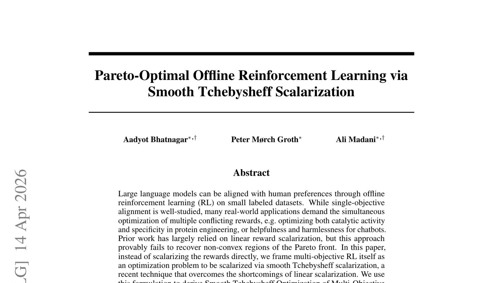 대규모 언어 모델은 소량의 레이블링된 데이터셋에 대한 오프라인 강화 학습(RL)을 통해 인간의 선호도에 맞춰 정렬될 수 있습니다. 이 논문은 '스무스 체비셰프 스칼라화(Smooth Tchebysheff Scalarization)'를 활용하여 파레토 최적 오프라인 강화 학습(Pareto-Optimal Offline Reinforcement Learning)을 달성하는 새로운 방법론을 제안합니다. 기존의 단일 목표 함수 기반 RL은 여러 상충하는 목표를 동시에 최적화하는 데 한계가 있었습니다. 연구자들은 이 다목적 최적화 프레임워크를 통해 모델이 다양한 선호도와 제약 조건을 동시에 만족시키는 파레토 최적 솔루션을 찾을 수 있음을 보여줍니다. 이는 LLM의 정렬(alignment) 문제를 해결하고, 인간의 복합적인 가치 판단을 AI 모델에 더 효과적으로 반영하는 데 중요한 진전입니다. 이 기술은 윤리적이고 공정한 AI 시스템 개발에 필수적인 도구가 될 것입니다.