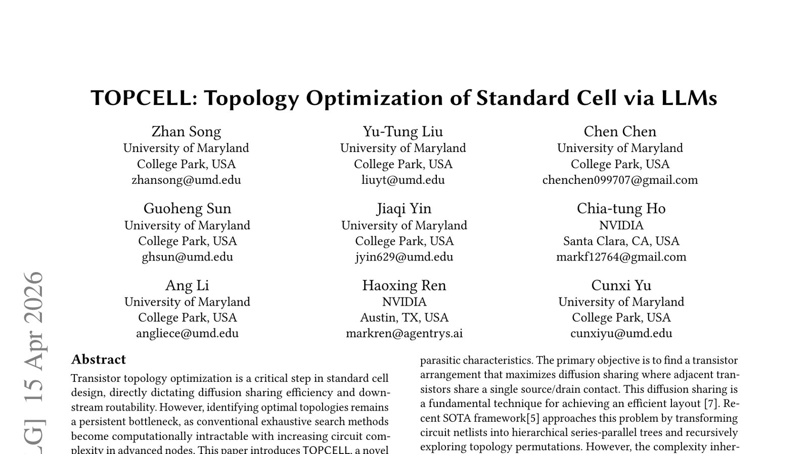 트랜지스터 토폴로지 최적화는 표준 셀 설계에서 매우 중요한 단계이며, 확산 공유 효율성과 라우팅 가능성에 직접적인 영향을 미칩니다—이 논문 'TOPCELL'은 대규모 언어 모델(LLM)을 활용하여 이 과정을 혁신하는 방법을 제시합니다. LLM을 통해 표준 셀의 레이아웃을 최적화함으로써, 설계 시간을 단축하고 전반적인 칩 성능을 향상시킬 수 있는 잠재력을 보여줍니다—이는 반도체 설계 자동화(EDA) 분야에서 LLM의 새로운 응용 가능성을 탐구하는 중요한 시도입니다. 전통적인 토폴로지 최적화는 매우 복잡하고 시간이 많이 소요되는 작업이었으나, LLM의 패턴 인식 및 추론 능력을 활용하여 이러한 과정을 효율화할 수 있습니다—이는 반도체 산업의 설계 주기 단축과 비용 절감에 기여할 수 있습니다. 이 연구는 AI가 단순한 소프트웨어 개발을 넘어, 물리적인 하드웨어 설계 분야에까지 영향력을 확장하고 있음을 보여줍니다—결국, TOPCELL은 AI가 산업 전반의 핵심 공정에 얼마나 깊이 통합될 수 있는지를 시사합니다.