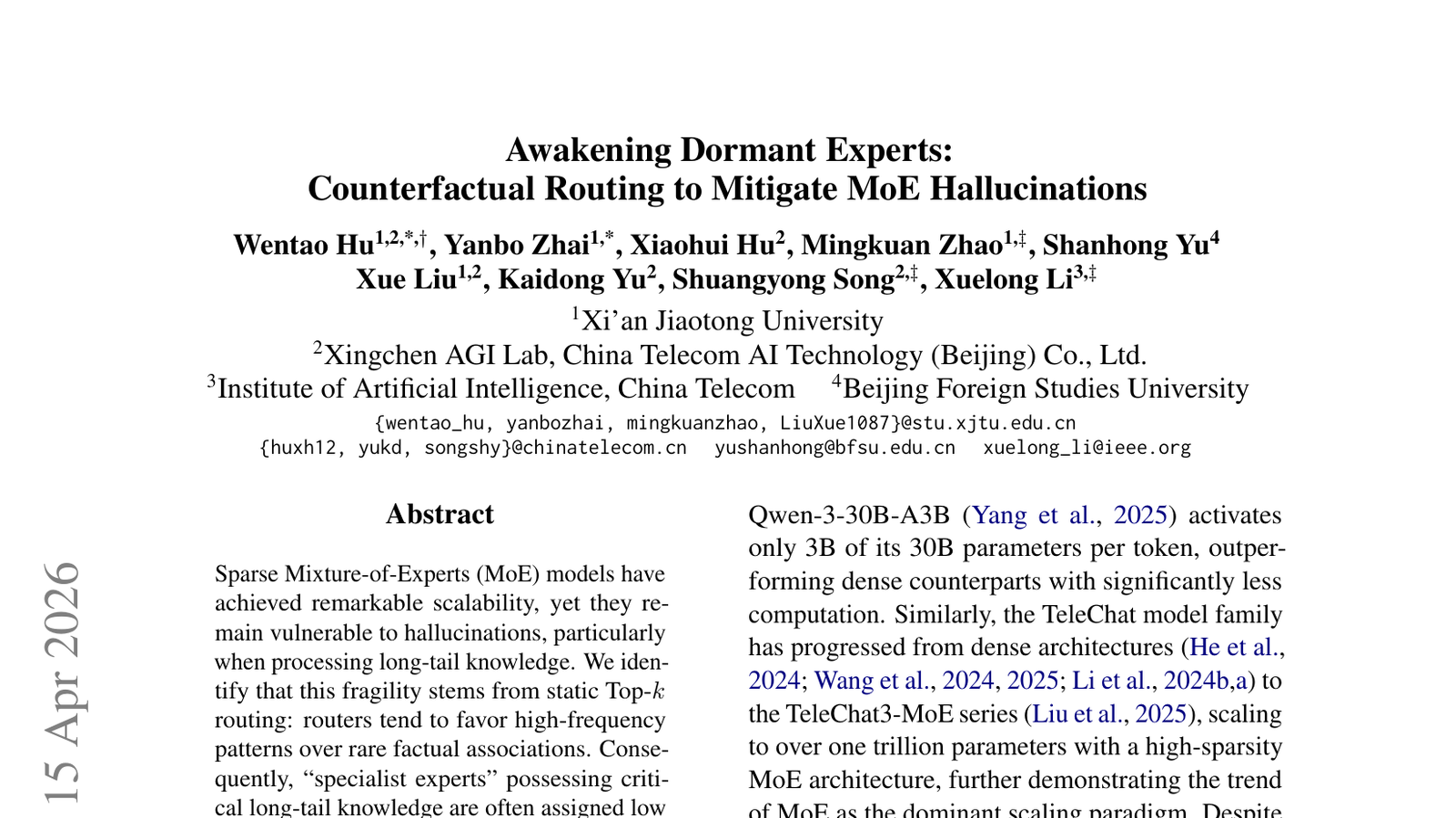 Sparse Mixture-of-Experts (MoE) 모델은 뛰어난 확장성을 달성했지만, 특히 복잡한 정보 처리 시 '환각(hallucinations)' 현상에 취약하다는 문제가 있습니다—이 논문은 'Awakening Dormant Experts'를 통해 MoE 모델의 환각 현상을 완화하기 위한 역대응 라우팅(Counterfactual Routing) 기법을 제안합니다. 이 기법은 모델이 잘못된 경로로 정보를 처리할 때, '잠자는 전문가(dormant experts)'를 깨워 올바른 정보를 찾아내도록 유도합니다—이를 통해 MoE 모델의 신뢰성과 정확성을 향상시킬 수 있습니다. MoE 모델의 환각 현상은 AI 시스템의 신뢰도를 떨어뜨리고 잘못된 정보를 생성하는 주요 원인 중 하나였으므로, 이 연구는 MoE 모델의 실제 적용 가능성을 높이는 데 중요한 기여를 합니다—특히 대규모 모델의 안정성과 안전성 확보는 AI 기술 상용화의 핵심 과제입니다. 이 연구는 AI 모델의 내재적 한계를 극복하고 더욱 견고한 AI 시스템을 구축하기 위한 중요한 발걸음이 될 것입니다—결론적으로, 이는 차세대 AI 모델의 신뢰성을 확보하는 데 필수적인 기술입니다.