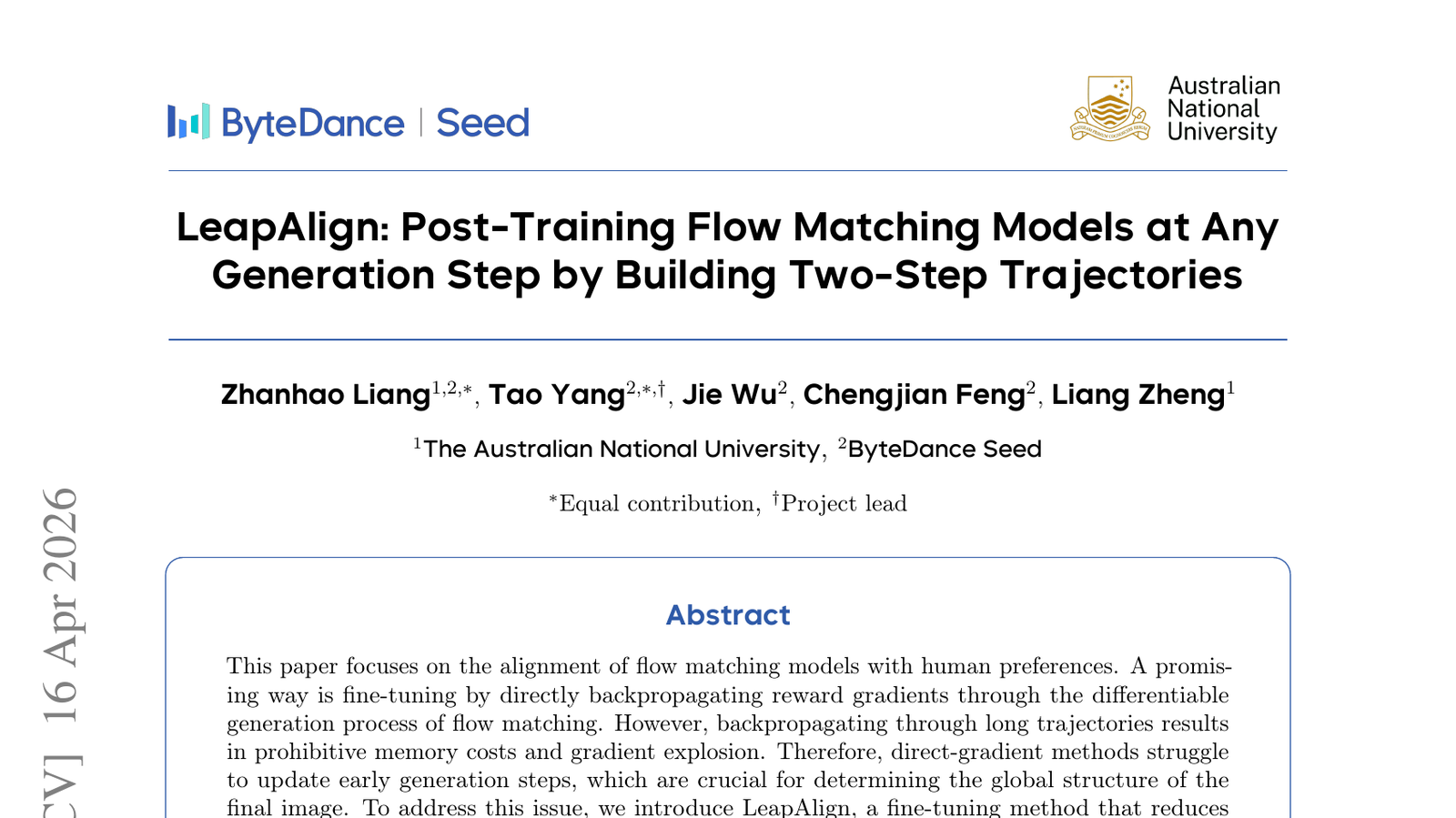 'LeapAlign'이라는 새로운 연구는 투 스텝(Two-Step) 궤적을 구축함으로써 어떤 생성 단계에서도 플로우 매칭 모델을 후처리 학습하는 방법을 제안합니다. 플로우 매칭 모델은 생성형 AI 분야에서 이미지, 오디오 등 다양한 데이터를 생성하는 데 사용되는 유망한 기술입니다. 이 논문은 기존의 플로우 매칭 모델이 특정 생성 단계에 고정되어 학습되던 한계를 극복하고, 모델이 다양한 생성 조건에 유연하게 대응할 수 있도록 합니다. 이는 AI 모델의 범용성과 효율성을 크게 향상시킬 수 있으며, 더욱 정교하고 제어 가능한 생성 AI 모델 개발에 기여할 것으로 기대됩니다. 특히, 이미지나 비디오 생성과 같이 순차적인 과정이 중요한 분야에서 LeapAlign의 방법론은 중요한 진전을 가져올 잠재력을 가지고 있습니다.