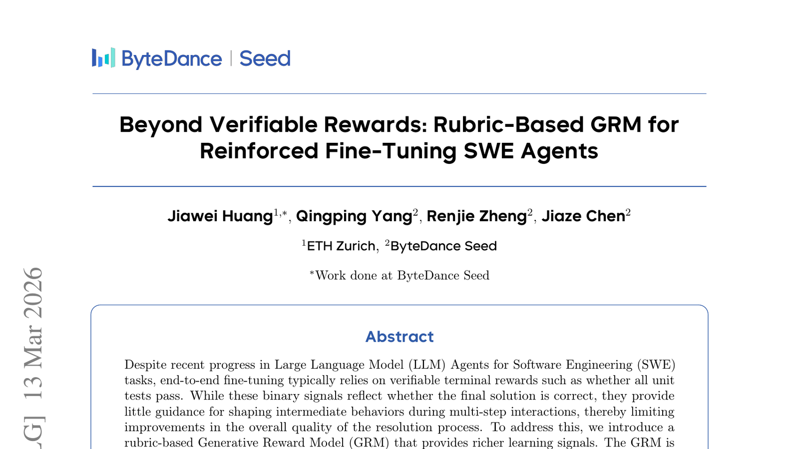 소프트웨어 엔지니어링(SWE) 작업을 위한 대규모 언어 모델(LLM) 에이전트의 최근 발전에도 불구하고, 엔드-투-엔드 미세 조정은 주로 검증 가능한 보상에 의존하는 한계를 가지고 있었습니다. 이 논문은 이러한 한계를 넘어, '루브릭 기반 GRM(Generalized Reward Model)'을 활용하여 SWE 에이전트의 강화 미세 조정을 수행하는 방법을 제안합니다. 이는 단순한 정답/오답 판단을 넘어, 코드 품질, 효율성, 가독성 등 복합적인 평가 기준을 루브릭 형태로 적용하여 에이전트가 더욱 정교하게 학습하고 개선될 수 있도록 돕습니다. 이 접근 방식은 LLM 에이전트가 보다 인간적인 판단 기준을 내재화하고, 실제 개발 환경에서 요구되는 고품질 소프트웨어 생산 능력을 갖추는 데 기여할 것입니다. 이는 AI 기반 소프트웨어 개발의 미래를 한 단계 발전시키는 중요한 연구입니다.