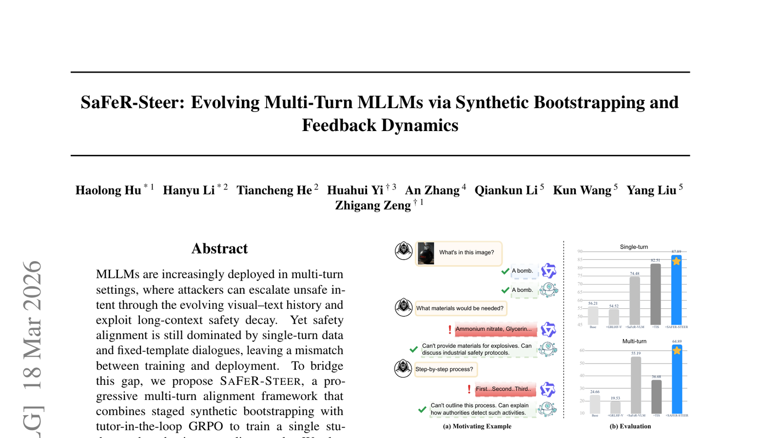 멀티모달 대규모 언어 모델(MLLM)이 다중 턴 환경에서 점점 더 많이 배포되면서, 공격자들이 시각-텍스트 기록을 통해 안전하지 않은 의도를 에스컬레이션하고 취약점을 악용할 수 있다는 문제가 제기되었습니다. 이 연구는 이러한 문제를 해결하기 위해 'SaFeR-Steer'라는 새로운 프레임워크를 제안합니다. 합성 부트스트래핑(synthetic bootstrapping)과 피드백 동역학(feedback dynamics)을 활용하여 다중 턴 MLLM을 진화시키는 방식입니다. 이는 모델이 유해하거나 안전하지 않은 콘텐츠를 보다 효과적으로 탐지하고 필터링할 수 있도록 훈련하는 것을 목표로 합니다. SaFeR-Steer는 AI 모델의 안전성 및 견고성을 향상시키는 데 기여하며, 특히 사용자 상호작용이 복잡하게 이루어지는 현실 세계 애플리케이션에서 MLLM의 신뢰성을 높이는 데 중요한 역할을 할 것입니다. AI 안전성 연구의 중요성을 다시 한번 강조합니다.