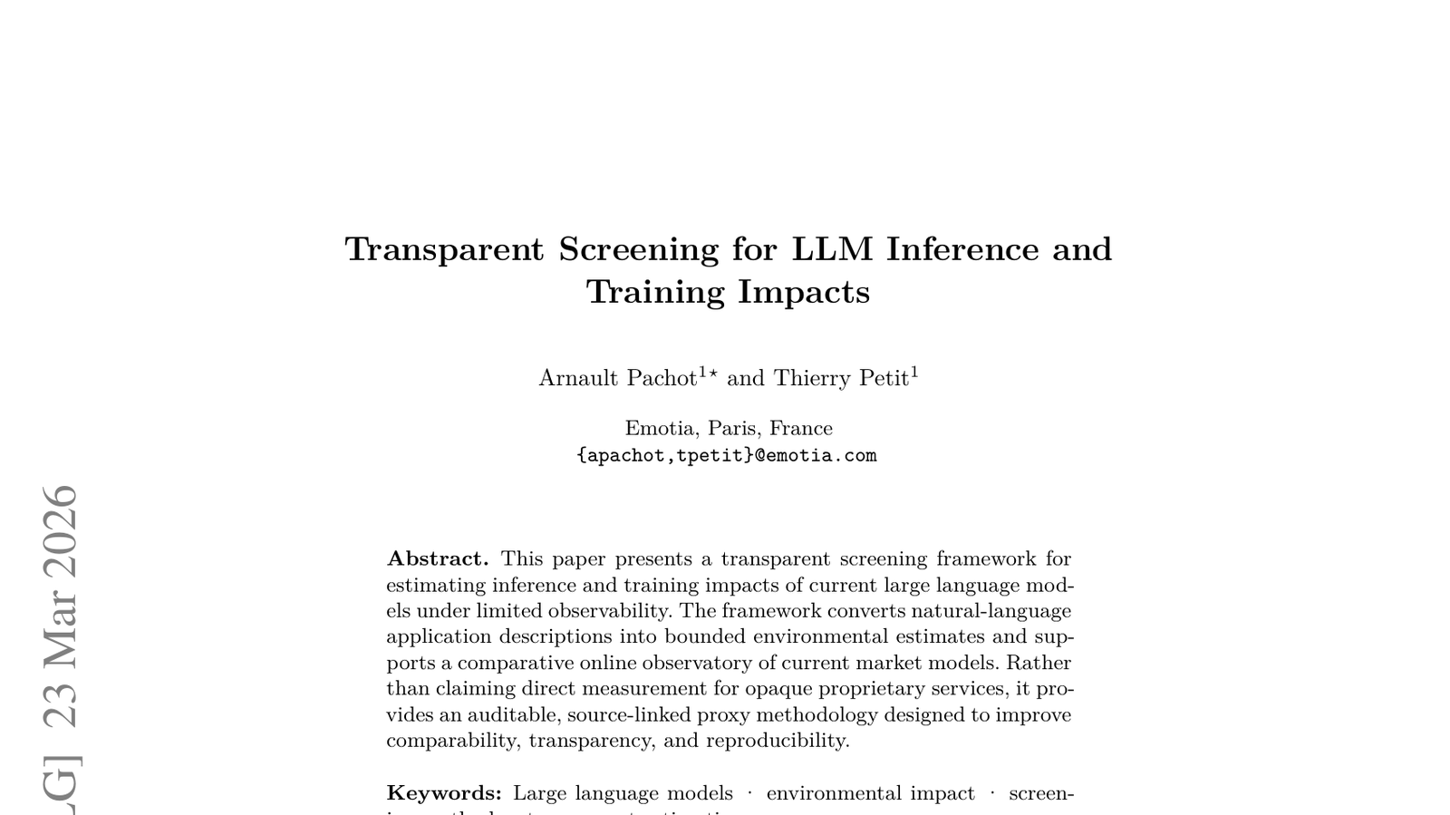 이 논문은 제한된 관찰 하에서 현재 대규모 언어 모델(LLM)의 추론 및 훈련 영향을 추정하기 위한 투명한 스크리닝 프레임워크를 제시합니다. LLM의 환경적, 사회적 영향을 정량화하고 투명하게 공개하는 것은 AI 윤리와 지속 가능성 측면에서 매우 중요합니다. 이 프레임워크는 LLM의 에너지 소비량, 탄소 배출량, 그리고 잠재적인 사회적 파급 효과를 더욱 정확하게 평가할 수 있도록 돕습니다. AI 기술의 발전 속도에 발맞춰, 그 부작용을 최소화하고 책임 있는 AI 개발을 위한 도구의 필요성이 커지고 있는 상황에서, 이러한 연구는 매우 시의적절합니다. 이는 AI 개발자들이 지속 가능한 방식으로 기술을 발전시키는 데 중요한 가이드라인을 제공할 것입니다.