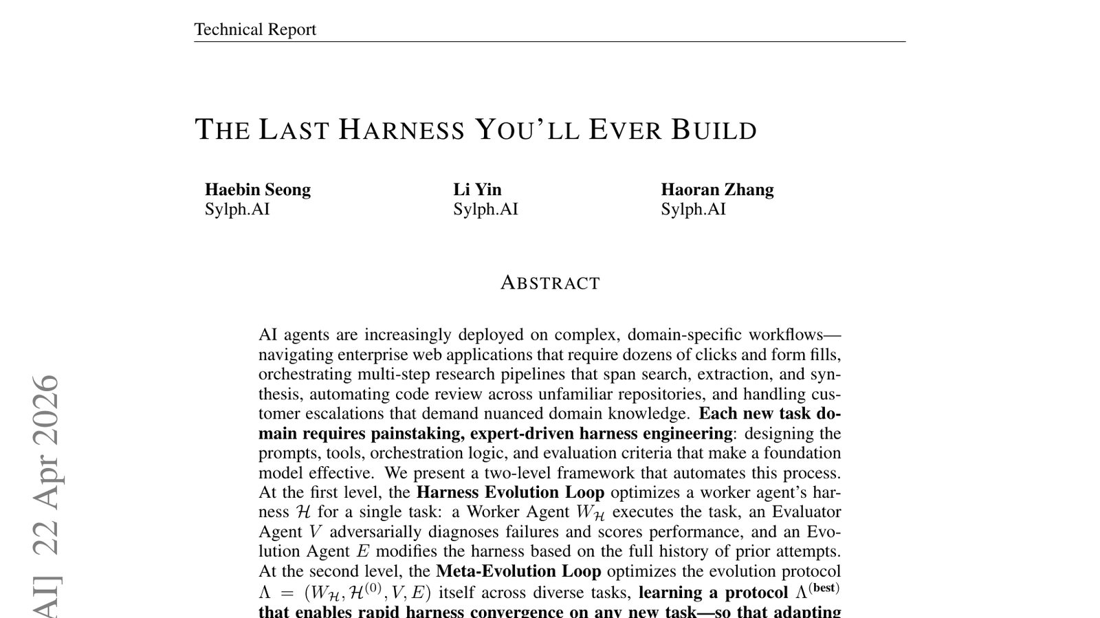 AI 에이전트를 복잡하고 도메인 특화된 워크플로우에 효과적으로 배포하기 위한 '최후의 하네스(The Last Harness You'll Ever Build)'라는 제목의 논문이 공개되었습니다. 이 논문은 수십 번의 클릭과 수동 조작이 필요한 엔터프라이즈 웹 애플리케이션과 같은 환경에서 AI 에이전트의 활용도를 극대화할 수 있는 프레임워크를 제시합니다. AI 에이전트가 단순히 특정 작업을 자동화하는 것을 넘어, 여러 시스템과 상호작용하며 복잡한 비즈니스 프로세스를 엔드투엔드로 처리할 수 있도록 돕는 것이 이 연구의 핵심입니다. 이는 기업 환경에서 AI 도입의 실질적인 장벽을 낮추고, AI 기반 자동화의 범위를 크게 확장할 잠재력을 가집니다. 궁극적으로, 이 '하네스'는 AI 에이전트가 인간의 개입 없이도 복잡한 디지털 환경을 능숙하게 다루게 하여 생산성을 획기적으로 향상시킬 수 있을 것입니다.