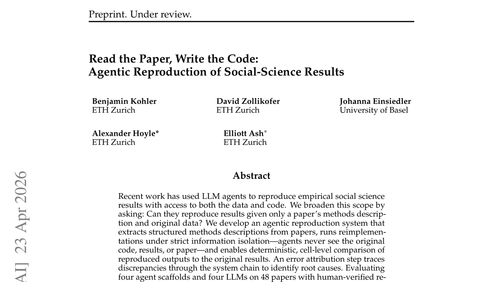 최근 연구는 LLM(대규모 언어 모델) 에이전트를 활용하여 사회 과학 분야의 경험적 연구 결과를 재현하는 가능성을 탐구하고 있습니다 — 이는 데이터와 코드를 기반으로 기존 연구를 검증하고 복제하는 새로운 접근 방식을 제시합니다. 과학계는 오랫동안 연구 재현성 문제로 고통받아왔습니다 — 많은 연구 결과들이 다른 연구자들에 의해 성공적으로 재현되지 못하면서 과학적 신뢰성에 의문이 제기되곤 했습니다. 이 논문은 LLM 에이전트가 연구 논문의 방법론을 이해하고, 주어진 데이터와 코드를 활용하여 연구 결과를 독립적으로 재현할 수 있음을 보여줍니다 — 이는 인간 연구자가 수작업으로 수행하던 검증 과정을 자동화하여, 연구 재현성의 효율성과 정확성을 크게 향상시킬 수 있는 잠재력을 가집니다. AI 에이전트의 이러한 능력은 단순히 코드를 실행하는 것을 넘어, 연구의 맥락을 이해하고 필요한 데이터를 처리하며, 복잡한 통계 분석까지 수행할 수 있는 수준으로 발전하고 있습니다 — 이는 과학 연구의 투명성을 높이고, 오류를 줄이며, 궁극적으로 새로운 과학적 발견의 속도를 가속화하는 데 기여할 것입니다. AI 에이전트가 과학 연구의 재현성을 높이고 효율성을 극대화하며, 인간 연구자의 업무 방식에 혁신적인 변화를 가져올 잠재력을 보여줍니다 — 이는 AI가 단순한 보조 도구를 넘어, 연구의 핵심 과정에 깊숙이 관여하는 미래를 예고합니다.