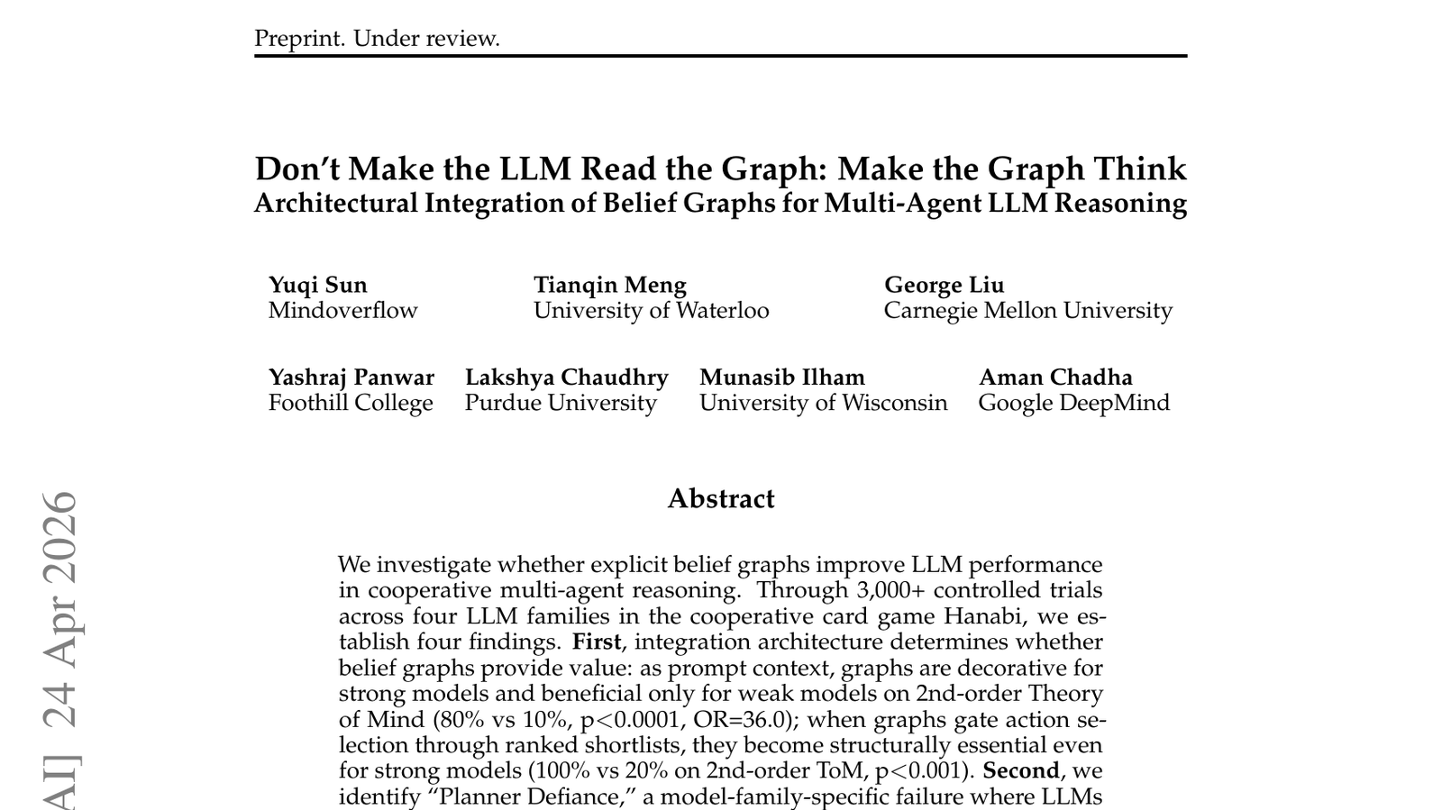 최근 'Don't Make the LLM Read the Graph: Make the Graph Think'라는 흥미로운 제목의 논문이 발표되었습니다. 이 연구는 LLM(대규모 언어 모델)이 협력적인 다중 에이전트 추론(multi-agent reasoning)에서 명시적인 신념 그래프(belief graphs)를 활용할 경우 성능이 어떻게 향상되는지 탐구합니다. 전통적으로 LLM은 텍스트를 직접 처리하여 추론하지만, 이 논문은 LLM이 그래프 구조화된 지식을 직접 '읽는' 것이 아니라, 그래프 자체가 독립적으로 '사고'하고 상호작용하는 방식으로 LLM의 추론 능력을 증강시킬 수 있다고 주장합니다. 3,000회 이상의 통제된 실험을 통해 연구자들은 이러한 '그래프 사고(Graph Thinking)' 방식이 다중 에이전트 시스템에서 LLM의 문제 해결 능력을 크게 향상시킨다는 것을 보여주었습니다. 이는 LLM이 단순히 텍스트를 이해하고 생성하는 것을 넘어, 구조화된 지식과의 상호작용을 통해 더욱 복잡하고 정교한 추론을 수행할 수 있음을 의미합니다. 이 연구는 AI 에이전트의 지능을 높이고, 인간과 유사한 인지 능력을 부여하는 데 중요한 통찰력을 제공합니다. 복잡한 의사 결정, 과학적 발견, 그리고 다중 에이전트 기반의 자율 시스템 개발에 이 기술이 활용될 수 있을 것으로 기대됩니다.